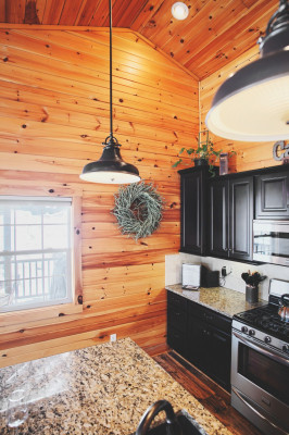 Views of the property’s rich and varied scenery are plentiful throughout the cabin’s open, airy floor plan. Granite countertops cap off the open-concept kitchen, the centerpiece of which is a fully featured, granite-topped island complete with automatic dishwasher, dual-basin sink, garbage disposal, storage and seating for four.