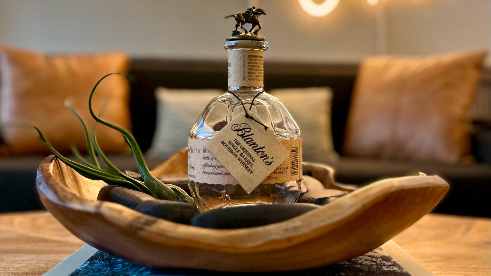 - Bourbon-themed decor with a cozy fireplace and mantel.