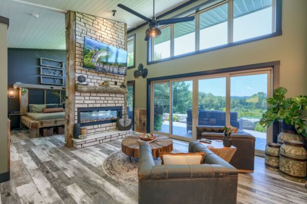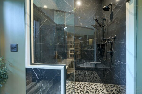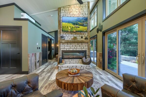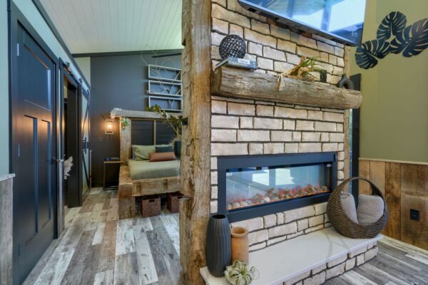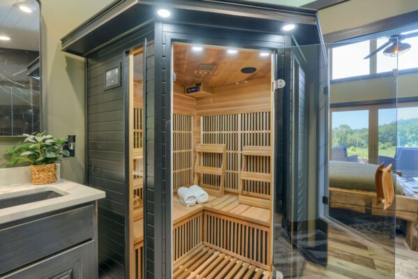 The cozy living area, complemented by an electric fireplace, provides a perfect atmosphere for relaxation. Immerse yourself in the healing benefits of our state-of-the-art infrared sauna, or indulge in a spa-like experience in our custom showers.