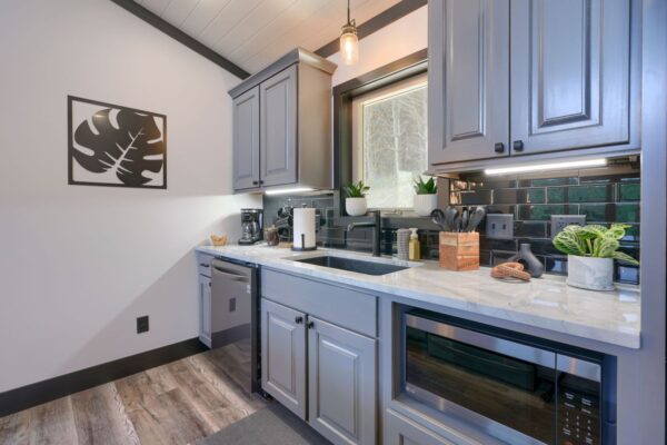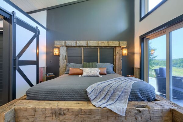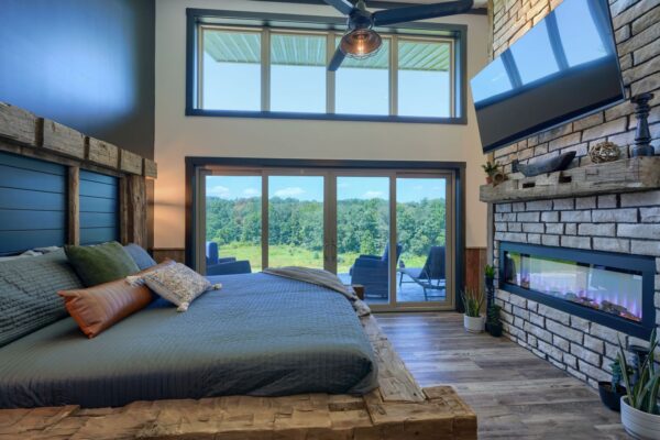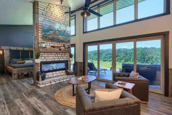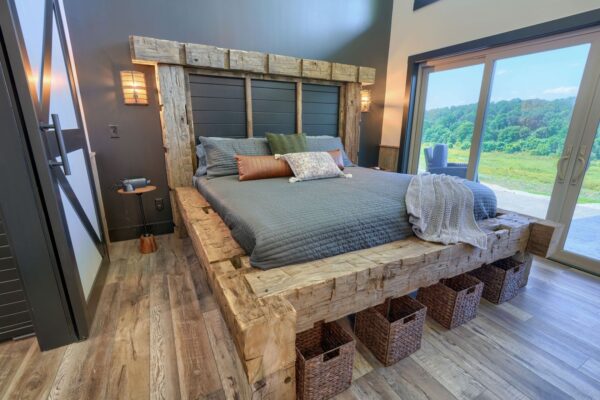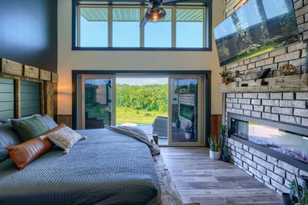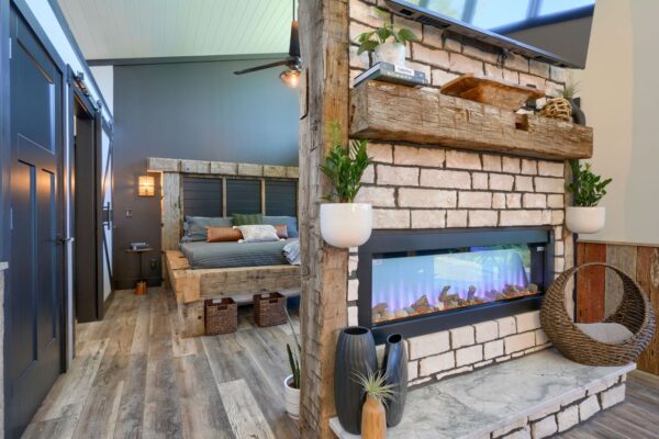 The cozy living area, complemented by an electric fireplace, provides a perfect atmosphere for relaxation. Immerse yourself in the healing benefits of our state-of-the-art infrared sauna, or indulge in a spa-like experience in our custom showers. Each cabin is adorned with unique furnishings that blend modern elegance with natural beauty.