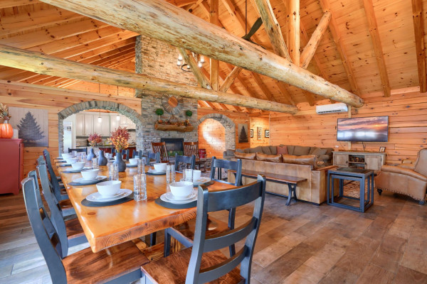 Inside, it has all the trappings of a traditional cabin in the woods; a statement stone fireplace, exposed beam ceilings and huge custom crafted 14-seat wooden dining table. But unlike an ordinary cabin, this Hocking Hills Lodge has luxury infused into its every fibre.
