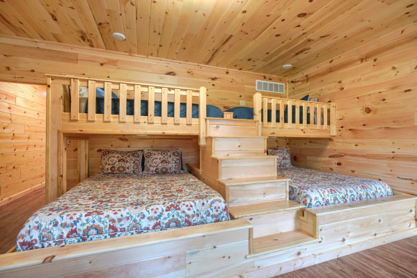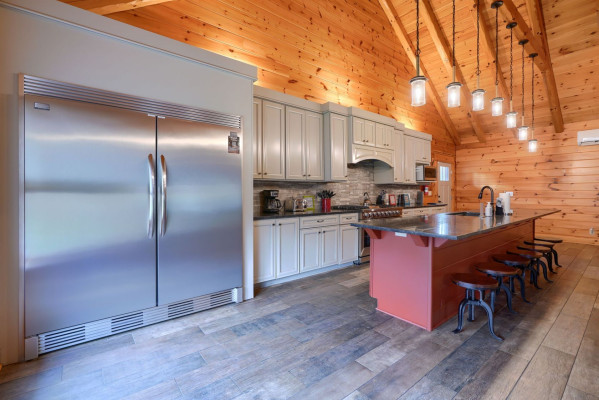 It is located in prime Hocking Hills real-estate; surrounded by woodlands, sweeping hills and impeccably maintained lawns. Perfect for families and friends. The Ridgemont Lodge can accommodate up to 24 guests, 16 if all adults – with 7 bedrooms, 5 bedrooms contain king sized beds, one bedroom with four sets of twin bunk beds, and one bedroom with two custom queen under twin bunk build outs – 5.5 luxurious family-sized bathrooms with walk in showers and plenty of living space, promising a comfortable stay for everyone.